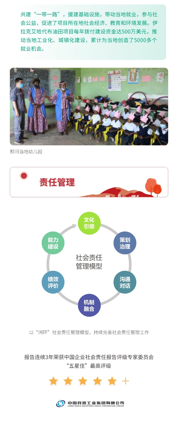 近日,兵器工業(yè)集團正式發(fā)布第十三份年度社會責任報告——《中國兵器工業(yè)集團有限公司2021年社會責任報告》,以“用心守護和平、用力爭創(chuàng)一流、用情溫暖社會”為主題,從恪守強軍首責、服務(wù)經(jīng)濟建設(shè)、共創(chuàng)美好生活三個維度,向社會全面披露2021年度履責實踐和履責業(yè)績。《報告》連續(xù)第三年獲得中國企業(yè)社會責任報告評級專家委員會“五星佳”評級,兵器工業(yè)集團成為軍工行業(yè)唯一連續(xù)11年獲得五星及五星佳最高評級的企業(yè)。 一圖解碼兵器工業(yè)的“責任力量” |