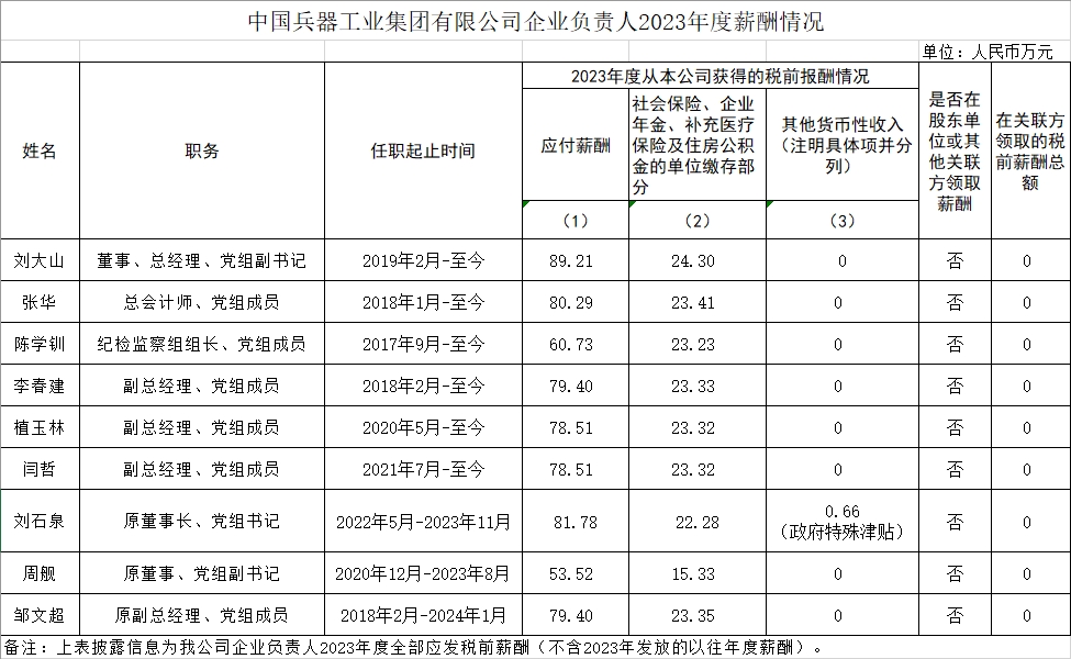 中國(guó)兵器工業(yè)集團(tuán)有限公司企業(yè)負(fù)責(zé)人2023年度薪酬情況